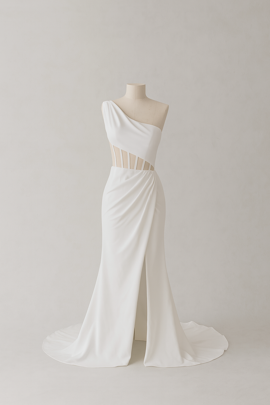 Clean, schlicht und dennoch besonders, WILCOX spielt mit den weiblichen Reizen und ist das perfekte Fit-und-Flare Brautkleid für die Standesamtliche Trauung. Der klassische Ausschnitt und die grazile Passform unterstreichen die natürliche Schönheit der weiblichen Figur. Der matte Crêpe liegt angenehm auf der Haut und bietet zu gleichermaßen Tragekomfort und Unterstützung. Für den perfekten Fit ist auch dieses Design mit einer Korsage und Push-Up-Cups ausgestattet, so kannst du dich an deinem großen Tag sicher und wunderschön fühlen. Die kurze Schleppe ist unkompliziert und pflegeleicht, gibt dir aber dennoch Braut-Vibes.